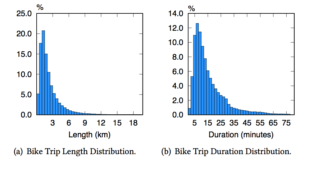 下面两张图图给出了骑行长度和骑行时间的大致分布状况,显然,大部分骑行距离集中在相对较近的路程附近(70%的骑行短于2km),骑行时间也集中于短时。