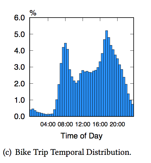 下图给出了开始骑行的时间在一天之间的分布,可以看到在早/晚上下班的“冲刺阶段”是最多人选择使用共享单车的时候