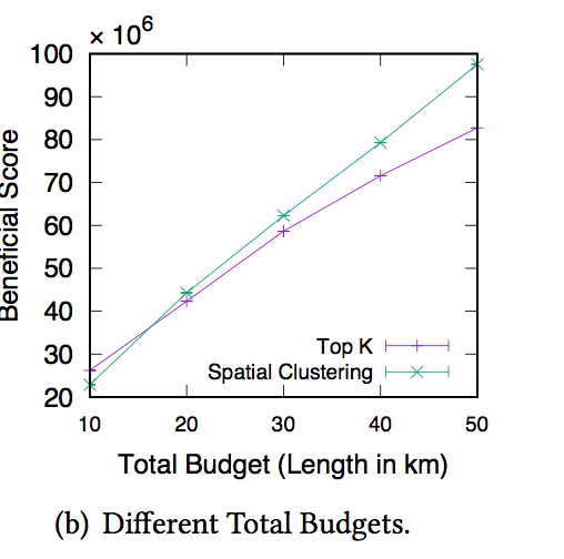 对于总体预算 $$ B $$ 下图也给出了不同预算在top-k和hierarchical spatial clustering两种策略下对效益的影响。